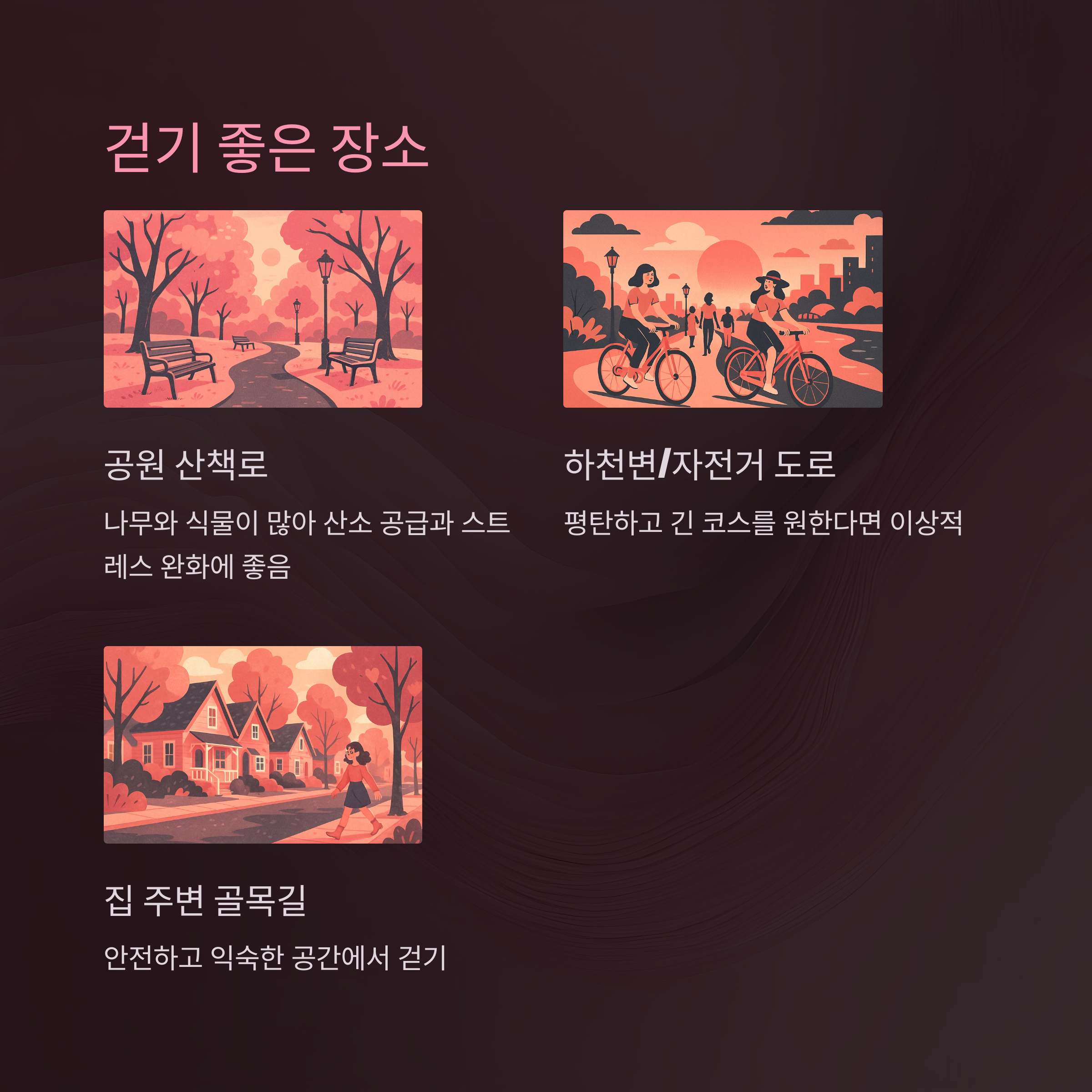 - 공원 산책로 : 나무와 식물이 많은 공원은 산소 공급도 좋고 스트레스 완화에 효과적입니다.